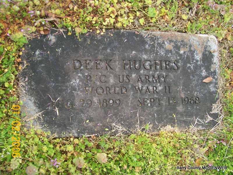 | HUGHES, Deek Dewey | Aug. 29, 1899 | Sept. 13, 1968 | Military Inscription: "PFC US ARMY WORLD WAR II" - Research Note: Culver Funeral Home reported Deek Dewey Hughes of Sioux City, Iowa, died Sept. 13, 1968. The date of the funeral was Sept. 18, 1968 at 3 P. M., and burial was in Painter Cemetery with Bro. Doyle Chapin, Cassville, MO in charge of the service. He was age 69 years old and single. The Culver data does not give any other details. - Son of Joseph T. Hughes and Mary Duffey Horrell. | Transcription Penny Cooper Bailey Photo Jay Trace Culver Funeral Home, Vol. 13, Page 52, by Ted Roller Donna Cooper Census Phyllis Long |