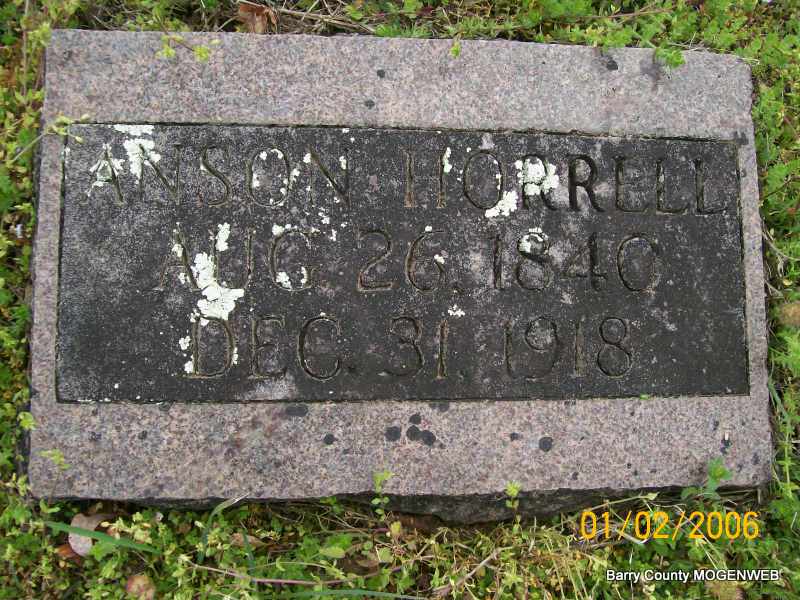 Research Note: He was the husband of Susan Louisa (Putnam) Horrell. Death certificate listed under Harrell. M. D. Hughes of Mt. Vernon, MO was the informant. Son of William Horrell. Daughter Ollie (Harrell) Ledgerwood is buried at Painter Cemetery. - Cassville Republican May 18, 1893 - Pension Board Examinations: Anson Horrall, Co. B. 89 Ill. Inf., Shell Knob. - Obit: ANSON HARRELL DEAD - A good man has fallen; a Christly man has gone to Him, who gave him life, that was lived for good and to help make others fitted for eternity. His every walk in life was to better humanity and he succeeded, Bless his memory. Anson Harrell was born in Indiana, August 26th, 1840 and lived to young manhood there. At the age of 17 years, he enlisted in the U.S. Army and served until it closed in 1865. He then returned home and went to Franklin County, Ill., where he was afterwards married to Miss Susan Louisa Putnam, on Oct. 26, 1865. To this union were born seven children, four boys and three daughters, four dying in infancy. The three surviving him, are: Mrs. M. D. Hughes and Boda Harrell of Mt. Vernon Mo., and Mrs. Ollie Ledgerwood of Oilton, Oklahoma. In 1877 he moved to Oregon County, Mo., for his health, but the country was rough and he only remained there one year and then moved to Dade county and resided there until 1887, when he moved to Shell Knob and lived there until his wife died in 1911; he then made his home with his three children. He died Dec. 31, 1918, at the home of his daughter, Mrs. M. D. Hughes in Mt. Vernon, and his remains were shipped to Cassville and then conveyed to Shell Knob and there laid to rest in Painter Cemetery beside his wife Jan. 4, 1919. He joined the Masonic Order at an early age and was a member of Pythagoras Lodge of this city, when he passed away. He was a true and zealous Mason and lived up to its teachings. He was christened in the Methodist Church when a baby and remained a member until he joined the C. P. Church, with his wife, where he remained faithful until his death. In his active life, nothing was too much for him to do for the sick or needy. He was an active church worker for 35 or 40 years and was superintendent of Sunday School for the same length of time. He died very suddenly, going to bed at 8 p.m. as well as usual and passed away by 9 p.m. The cause of his death is thought to be hemorrhaging of the brain. | Online Obit Ted Roller Transcription Penny Cooper Bailey Online Newspapers Death Certificate Phyllis Long Photo Jay Trace |