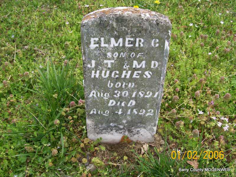 | HUGHES, Elmer G. | Aug. 30, 1891 | Aug. 4, 1892 | Inscription: "Son of J. T. and M. D." - Research Note: Son of Joseph T. Hughes and Mary Duffey Horrell. | Transcription Penny Cooper Bailey Note Phyllis Long Photo Jay Trace |