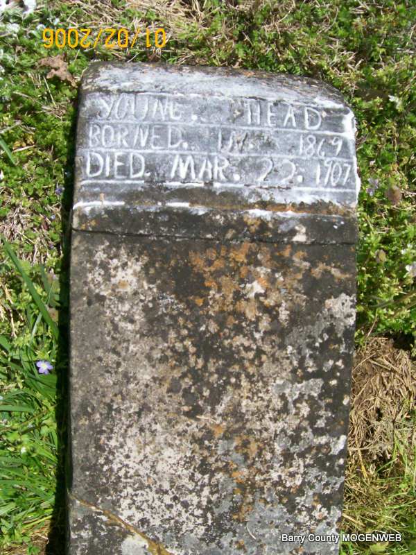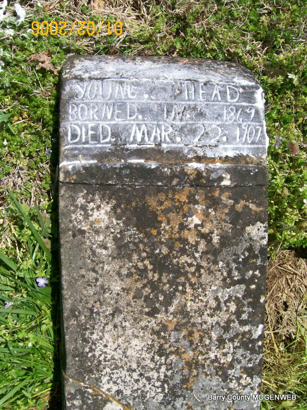Mar. 22, 1907 | Inscription: "Borned in 1869" - Research Note: Son of John Head and Polly Boyer. His wife was Louvicy "Vicie" Bouyer. The 1900 census has his birth date as June 1869. - 1900 Barry Co., MO, Shell Knob - Head, Young, head, M, Jun/1869, 30, M, 9, MO NC MO farmer; Head, Lerisa, wife, F, Mar/1875, 25, M, 9, 4, 4, MO MO MO; Head, Homer E., son, M, Mar/1893, 7, S, MO MO AR; Head, Lou Girtie, dau, F, Apr/1895, 5, S, MO MO AR; Head, John Melvin, son, M Aug/1895, ?, 4, ?, S, MO MO AR; Head, Ellis, son, M Jun/1899, 4, S, MO MO AR. - Another Photo | Transcription Penny Cooper Bailey Photos Jay Trace Census Donna Cooper |