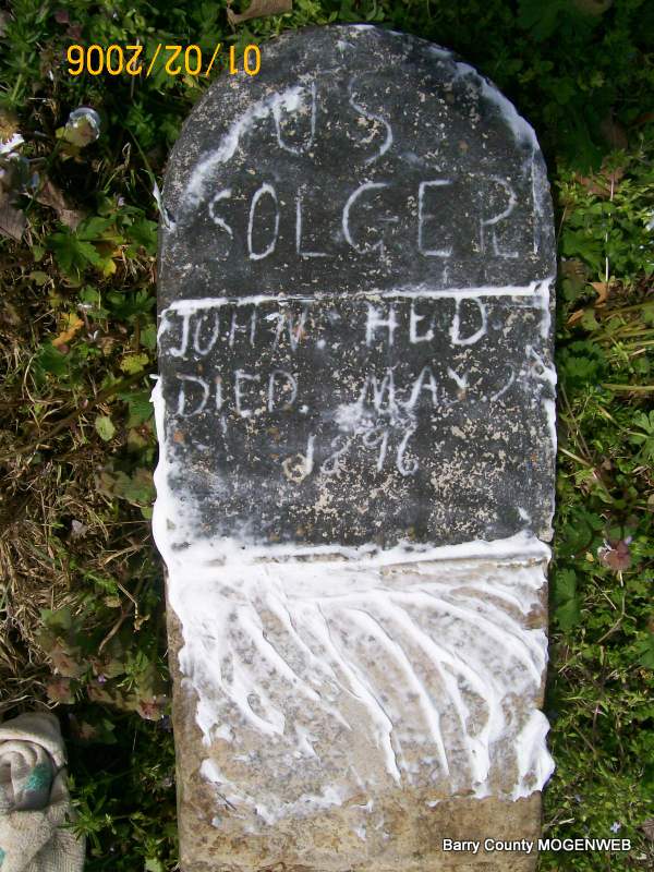 May 29, 1896 | Inscription: "US Solger" - Research Note: Son of Spencer Head and Anne Beeman. John Head, born 1823 NC, first married Elizabeth Pipkin, born 1826 TN, on June 2, 1840 in Maury Co., TN. He second married Polly Boyer. John Head, age 65, married Mary Ann Humphrey, age 61 on Aug. 11, 1895 in Barry Co., MO. - Cassville Republican, June 11, 1896 - May 29th our little valley was called to mourn the loss of John Head of Eagle Rock, who was here visiting his son-in-law, W. H. Holman. While driving his mule, into the barn, the 27th, the animal kicked, striking him just above the hip and below the lower rib. No one supposed the injury fatal until Thursday night, when he lost consciousness and before the aid of the physician could be called his passed away, at about 8 o'clock Friday morning. Saturday the body was presented to the G. A. R. order for burial. As Decoration Day was observed at the schoolhouse, flowers were lovingly and tenderly placed on the coffin and a beautiful song was sung after which Elders Greenstreet and G. S. Cottrell made nice talks and all were asked to follow to the cemetery where the remains were placed within the limits of the tomb. Mr. Head leaves a wife and children, all grown, to mourn his absence. The people of Shell Know showed their respect to the old gentlemen in a way that will never be forgotten. He being a stranger among us, it shows that he has the sympathy of others. U. C. Shell Knob. | Transcription Penny Cooper Bailey Online Obit Census TN Marriage Records MO Marriage Records Phyllis Long Photo Jay Trace |