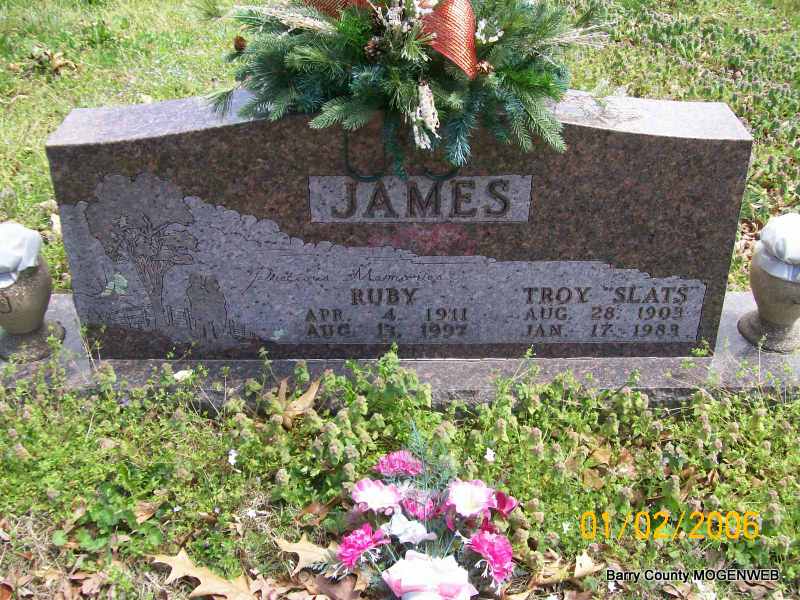 SSW: Ruby - Inscription: Married Mar. 13, 1930" - Research Note: Son of Francis A. and Nancy (Epperly) James. Husband of Ruby Hardman. - Obit: Troy James, 79, Shell Knob, died at 2:58 a.m. Monday, January 17, 1983, at Springdale, Ark., Memorial Hospital, where he had been a patient one week. Mr. James, born August 28, 1903, at Shell Knob, was a lifelong resident of this community. He was a retired farmer. He married Ruby Hardman on March 13, 1930, at Berryville, Ark. Surviving are a daughter; a son; a sister; seven grandchildren and four great-grandchildren. Services were at 10 a.m. today, (Wednesday) at First Baptist Church, Shell Knob, with Rev. Max Edmondson, Rev. Wayne Writer and Rev. Jess Higgs officiating. Burial was in Painter Cemetery. - Back of Stone - Another Photo - Another Photo | Transcription Penny Cooper Bailey Obit Frances Albert Photos Jay Trace |
