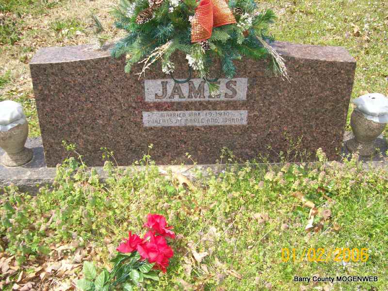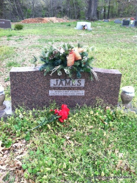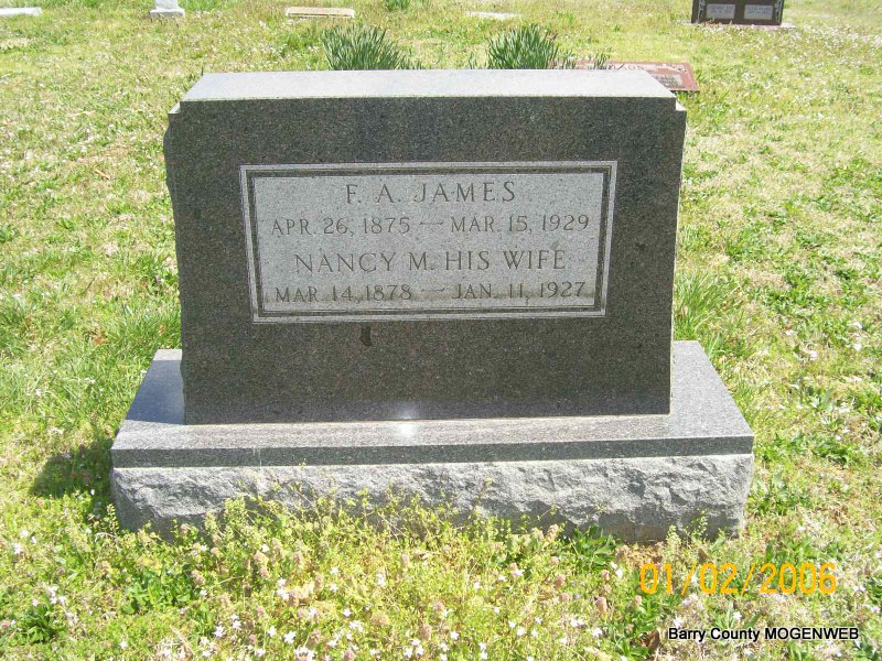 SSW: Francis Asbury - Research Note: Her death certificate reads that she was the wife of F. A. James, Jr., and she has a double stone with F. A. James. Her father was given as Perry Epperly, born in MO and her mother as Mary E. Wilcox, born in MO. Her death was caused from the effects of lumbar pneumonia. She was age 48 years, 9 months and 27 days old. F. A. James, gave the information. Nancy M. Epperly, age 18, married Francis A. James, Jr., age 21, on Dec. 25, 1896 in Barry Co., MO. | Transcription Penny Cooper Bailey Death Certificate Donna Cooper MO Marriage Records Phyllis Long Photo Jay Trace |