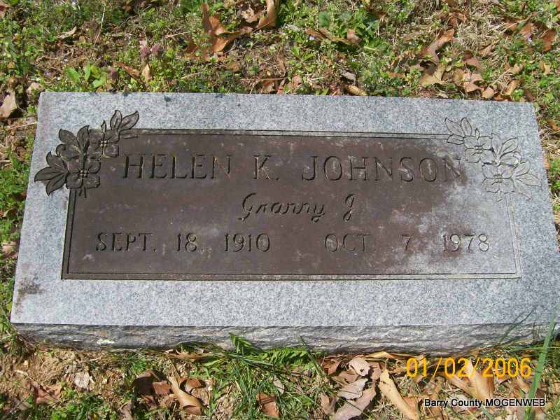 | JOHNSON, Helen K. | Sept. 18, 1910 | Oct. 17, 1978 | Inscription: "Granny J." | Transcription Penny Cooper Bailey Photo Jay Trace |