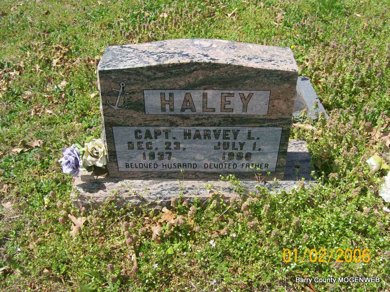 Inscription: "Beloved Husband - Devoted Father" - Research Note: Notes at findagrave.com: Harvey Lee Haley, son of Jasper Jerry and Eula Virginia (McCann) Haley, was born in Magnolia, MS. He was a tug boat captain for thirty three years and became a Master Mariner in 1990. He achieved the high honor of membership in the Masters Mariners Association, Seattle, Washington, not many months before health problems caused his early retirement. He moved to Shell Knob in 1991 from Seattle, Washington. | Note SS Claims Index Phyllis Long Photo Jay Trace |
