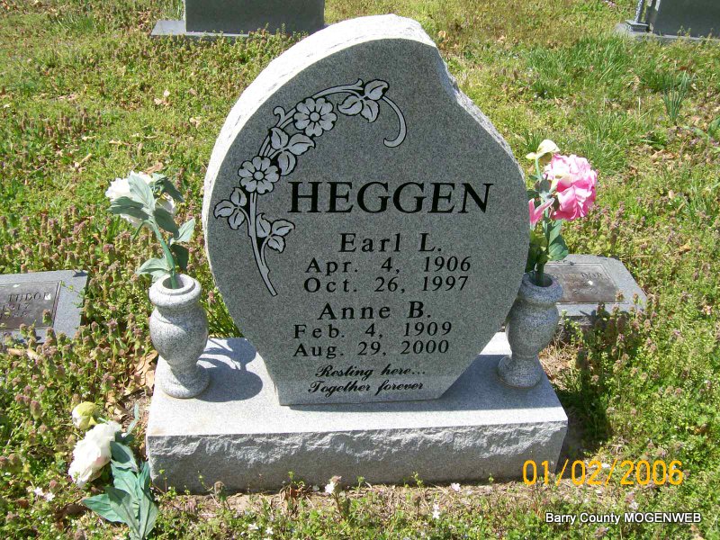 | HEGGEN, Anne Barbara (PEGENAS) | Feb. 4, 1909 | Aug. 29, 2000 Shell Knob, Barry Co., MO |