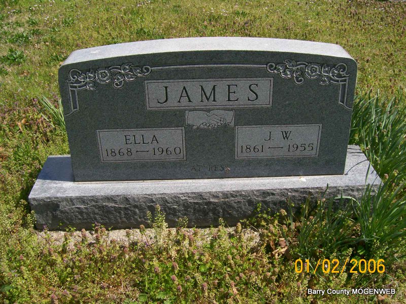 SSW: Ella - Research Note: His death certificate reads that he was a son of Francis A. James and Elizabeth Painter. He was married and his wife's name was Matilda E. James. Mrs. J. C. Hill, Cassville, MO, gave the information. - Obit - James W. James, Shell Knob, who died Monday (May 30, 1955) morning at his home. Mr. James, who had resided all of his life in the Shell Knob community, was born Oct. 21, 1861. Bro. Cline Hancock conducted the funeral. Burial was in Painter Cemetery. His death certificate has Oct. 22, 1861 as his birth date and the obit has Oct. 21st. | Transcription Penny Cooper Bailey Obit Death Certificate Donna Cooper Photo Jay Trace |