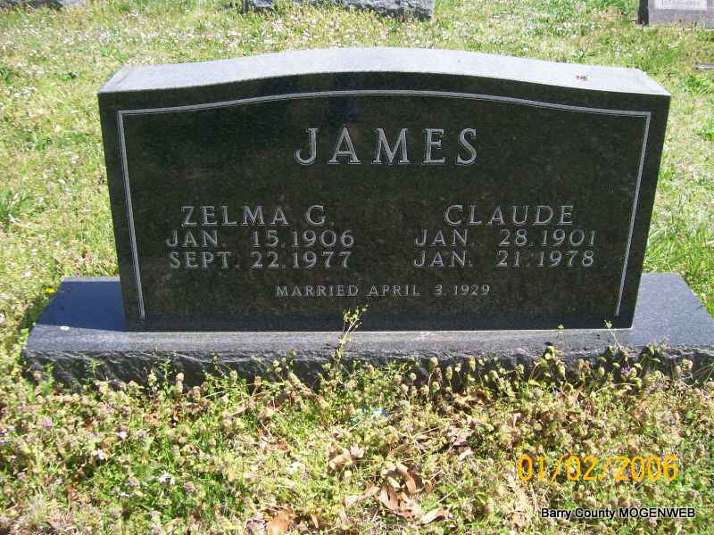 Jan. 21, 1978 | SSW: Zelma C. - Inscription: "Married April 3, 1929" - Research Note: Son of Francis and Nancy (Epperly) James - Husband of Zelma Blythe married Apr. 3, 1929. Frances Albert posted this obit: Funeral services for Claude James, 76, were held January 25, 1978 at the First Baptist Church of Shell Knob with Bro. Max Edmondson and Bro. Jess Higgs officiating. Burial was in the Painter Cemetery, under direction of Axley's Lakeside Mortuary of Shell Knob. Mr. James was a lifetime resident of Shell Knob. He was born the son of Nancy M. Epperly and Francis A. James, Jr. on January 28, 1901 in Shell Knob. The James family was one of the first families to settle in Shell Knob. Claude James was a fourth generation of a family originating from Virginia. The family moved from Virginia to Arkansas for a short time and then settled in the Shell Knob area. On April 3, 1929, Claude James and Zelma Blythe were united in marriage in Cassville, Missouri. To this union were born three daughters. Claude was a well known person in the Shell Knob area. He could ably bridge the olden days of the river and bottom country to the present lake area. Individuals returning to the area would always seek him out to find old landmarks of their past. He could recall for them stories and reminisce with them about their family histories. He was a jovial, fun living person. He had the ability to cheer you up no matter how down you were, just to be near him. He was a farmer all his life and especially enjoyed raising Hereford cattle on the farm on the lake where his ancestors originally lived. Left to mourn his passing are his three daughters, four grandchildren; one brother; and two sisters. He was preceded in death by his brother, Gilbert in 1929 and his wife Zelma, September 22, 1977. | Transcription Penny Cooper Bailey Obit Frances Albert Photo Jay Trace |