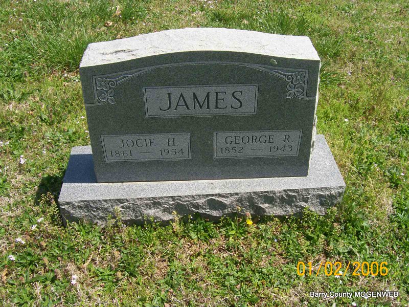 SSW: George R. - Research Note: This was incorrectly posted in Viney Cemetery by Carole. Her post reads: 2nd marriage for Jocie, daughter of William Nelson Martin and Elizabeth Ann Merritt. Death certificate gives daughter of William and Elizabeth Martin. Mrs. Pearl Pope of Cassville, MO was the informant. Josephine Martin married Joseph Brazle/Brazell on Dec. 27, 1875 in Joplin, Jasper Co., MO. Josephine Brazell married George "A". James on Aug. 30, 1884 in Barry Co., MO. | Transcription Cheli McCord Family Records Carole Martin Ring Death Certificate MO Marriage Records Phyllis Long Photo Jay Trace |