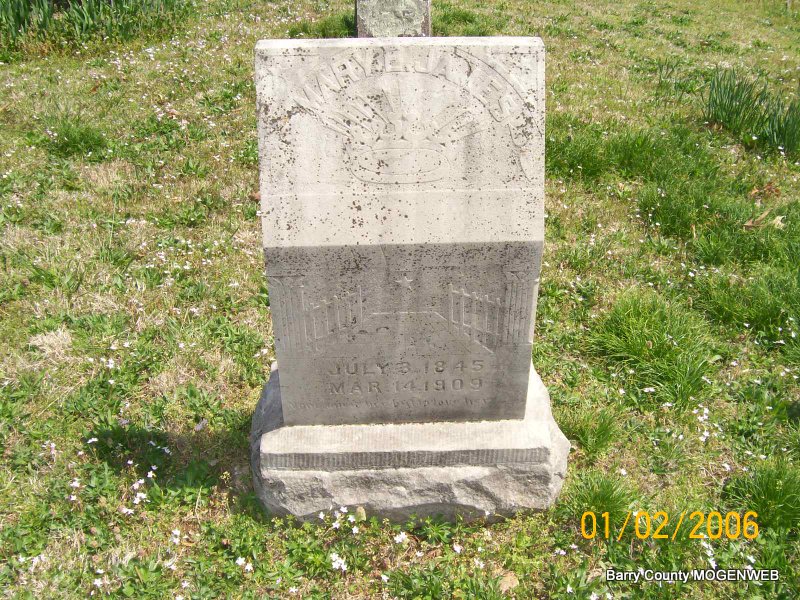 Mar. 14, 1909 | Research Note: Wife of David Elias. Obit says she was buried in Clark Cemetery but her stone is here. - Cassville Democrat, March 27, 1909 - Mrs. Mary James, widow of the late Elias James, died at the home of George James, Sunday afternoon, age ? Her remains were ? to Clark Cemetery. She was a member of the Baptist Church for many years and lived a devoted Christian life to the end. She left relatives and many friends to mourn their loss. We sympathize with them in their bereavement. - Researchers say she was the daughter of Andrew S. Viney and Mary Bryant. In the 1880 census, David and Mary are in Johnson Co., TX. They were married Mar. 7, 1870. | Transcription Penny Cooper Bailey Online Obit Census TX Marriage Index Record Book E Phyllis Long Photo Jay Trace |