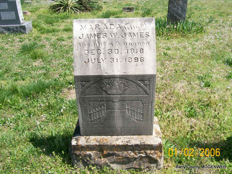 Inscription: "Wife of James W. James - Also Wife of D. Wagnon" - Research Note: Marady Sutton married James W. James on Dec. 13, 1833 in Independence Co., AR. Researchers say she was the daughter of Dempsey Sutton and Elizabeth Donoho. Married Daniel Leonard Wagnon. (Note by Phyllis) Must have married a Patterson and also a Clark. - 1880 Census, White River, Barry, Missouri - John Clark, head, age 35, born KY, widowed; Marada Wagnon, age 60, born TN, widowed, mother. | Transcription Note Cheli McCord AR Marriage Index Census Phyllis Long Photo Jay Trace |