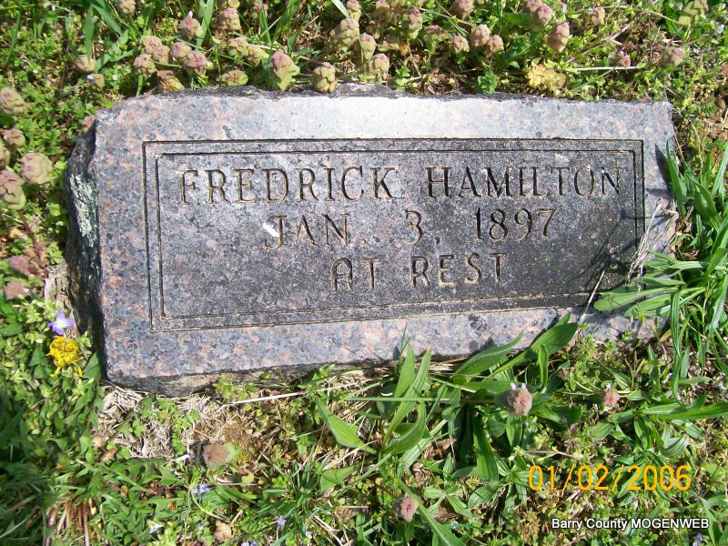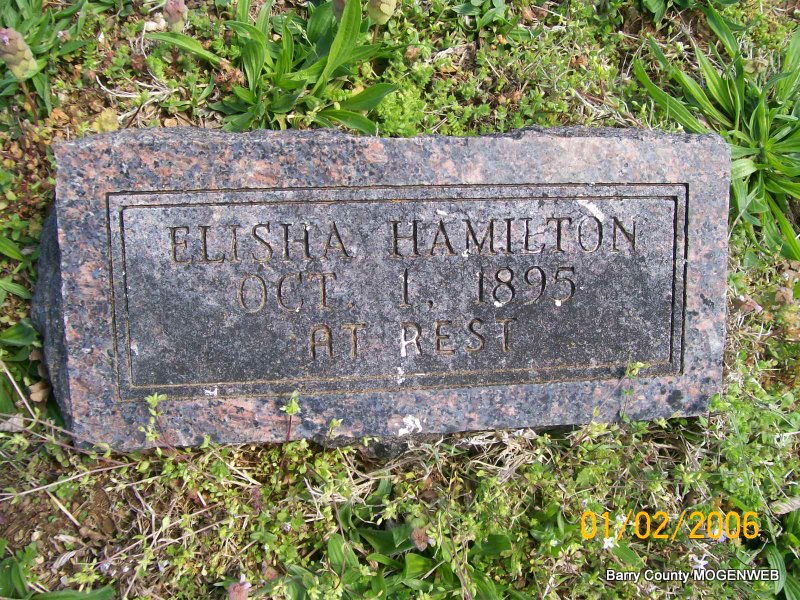 | HAMILTON, Elisha | No Date | Oct. 1, 1895 | Inscription: "At Rest" - Research Note: Infant son of Creed Hamilton and Armittie Clementine Smith, both buried at Mineral Springs Cemetery. His stone matches the one for Fredrick Hamilton. - 1900 census Shell Knob, MO gives Creed, age 39, Mittie, age 35, daughter Tony May, age 12, daughter Sarah, age 10, son Lyman, age 7, and daughter Margaret, age 2. Mittie is the mother of 6 children, 4 living. | Transcription Penny Cooper Bailey Photo Jay Trace Census Phyllis Long |