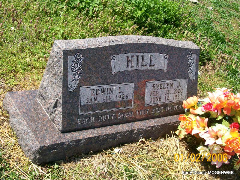 SSW: Evelyn J. - Research Note: He was the son of Elisha Lafayette and Jewell Fern (Bradley) Hill. On November 13, 1953 in Kansas City, Kansas he was united in marriage to Evelyn J. Root, who preceded him in death on June 12, 1991. Also preceding him in death were his parents and a daughter, Jean in 1994. Ed grew up and received his education in Kansas City, Kansas and graduated from Wyandotte High School. During World War II he joined the United States Army serving from July 10, 1944 until August 19, 1946. He was an electrician and worked for Local Union 124 in Kansas City, Missouri. In 1988 he moved from Shawnee Mission, Kansas to Shell Knob to make his home, and in 2015 moved to Marionville. | Fohn Funeral Home Phyllis Long Photo Jay Trace |