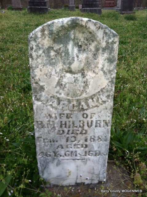 Inscription: "Wife of R. M. Hilburn - Age 46 years 6 months 16 days" - Research Note: Penny's Note: Daughter of John B. and Elizabeth (Lauznie) Brock. Donna's Note: In 1880 Marcana was listed as the wife of Richard Hilburn on the US Census and was living in White River Twp. She was born in TN with TN born parents and reported that she was age 46, so the age of 46 on her stone is correct. Richard was age 44, born in TN. These were in the household: Richard Hilburn, 44; Marcana Hilburn, 46; Elizabeth Hilburn, 15, born IL; Thomas J. Hilburn, 12, born MO; Zadock Hilburn, 11, born MO; Hyram A. Hilburn, 9, born AR. | Transcription Penny Cooper Bailey Photo Jay Trace Census Donna Cooper |