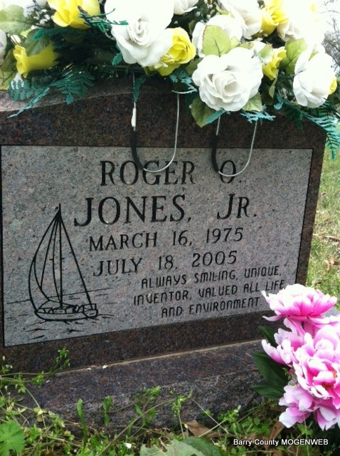 Research Note: Roger Oneal Jones Jr., 30, of Fayetteville, Arkansas, died July 18 from injuries sustained in a plane crash. Mr. Jones was born March 16, 1975, in Searcy, Arkansas. He was an Air Force veteran and was employed at North American Marine Industries Inc. in Lampe as vice president of operations. He married Kara Buchheit on August 24, 1996, in Carthage, and she survives. Additional survivors include two brothers, Michael Jones of Nixa and Michael Shaffer of Eagle Rock; his mother, Vickie Shaffer of Shell Knob; his step-father, Roger Jones of Newport, Arkansas; and one sister, Cori Shaffer of Baltimore, Maryland. He was preceded in death by his father, John Shaffer. Services will be 2 p.m. Friday, July 22, at Central Community United Methodist Church in Shell Knob. Burial with military honors will be in Lake Park Memorial Gardens in Shell Knob under the direction of Fohn Funeral Home of Shell Knob. Donna's Note: the obit reads that he was buried in Lake Park, but the stone is in Painter. | Photo Jay Trace Monett Times Donna Cooper |