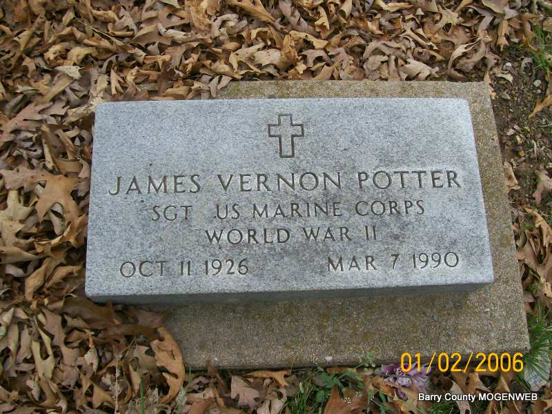 | POTTER, James Vernon | Oct. 11, 1926 | Mar. 7, 1990 | Inscription: "SGT US MARINE CORPS - WW II" - Research Note: Son of William F. Potter and Beryl Grey. James V. Potter, age 30 born Oct. 11, 1926, married Joyce S. Reed, age 25 born Feb. 3, 1932, on Mar. 2, 1957 in Kansas City, Jackson Co., MO. | Transcription Penny Cooper Bailey SS Claims Index MO Marriage Records Phyllis Long Photo Jay Trace |