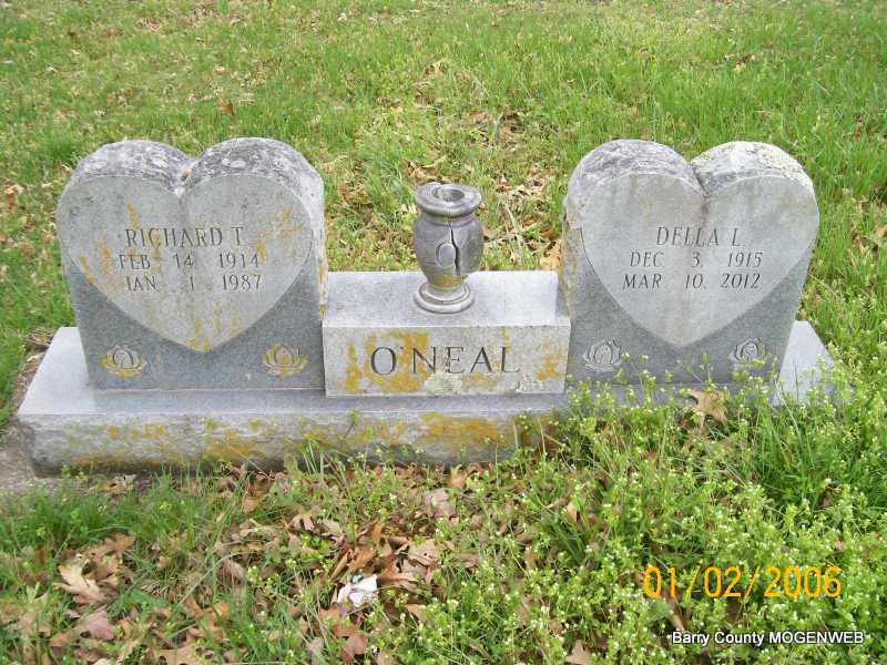 SSW: Richard T. - Research Note: Della was the daughter of John T. and Nettie Mae (Lynn) Martin. In October, 1949, she was united in marriage to Richard O'Neal, who preceded her in death on January 1, 1987. Also preceding her in death were her parents, two sisters, Ellena and Marie; one brother, Telly; one nephew, Robert Dale Zeigler and one niece, Peggy Zeigler. Della grew up and received her education in Indiana, graduating from high school in Milroy and then graduated from Beauty School in Indianapolis, Indiana. She was a licensed hairdresser for several years. In 1970, she moved from South Bend, Indiana to Shell Knob to make her home. She was a member of Central Community United Methodist Church in Shell Knob. There were no children. | Transcription Penny Cooper Bailey Fohn Funeral Home Phyllis Long Photo Jay Trace |
