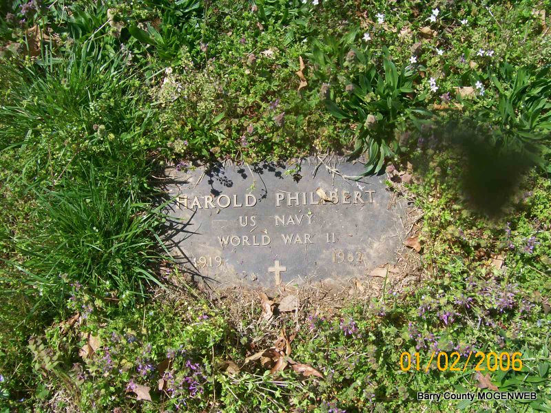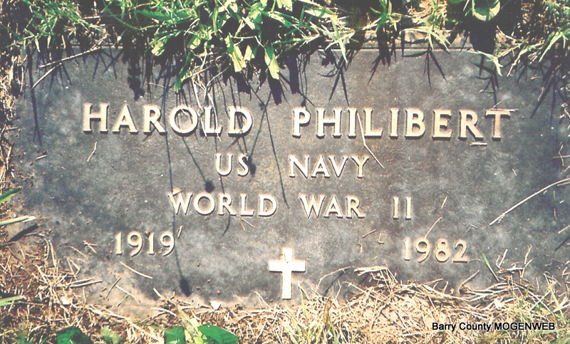 SSW: Marie - Inscription: "Married March 16, 1940" - Research Note: Son of Charles Benjamin Austin Philibert and Elizabeth (Applegate) (Burris) (Philibert) Matthews. - Wednesday, June 9, 1982, Springfield Leader and Press - SHELL KNOB - Graveside services for Harold Philibert, 62, Shell Knob, were to be at 2 p.m. today in Painter Cemetery, south of Shell Knob with the Rev. Whitley Garrett officiating. Burial is under the direction of Williamson of Shell Knob. Mr. Philibert died at 12:45 a.m. Monday in St. John's Regional Health Center where he had been a patient for three weeks. He had lived in the Shell Knob area for the past eight years, having moved here from Fort Worth, Texas. He was a retired inspector of Delta Airlines of Fort Worth and an Army and Navy veteran of World War II. Survivors include his wife, Marie; his son, a daughter; two brothers; two sisters ; and two grandchildren. - Military Stone - Inscription: "US NAVY WORLD WAR II" - Military Stone - Another Photo | Transcription Penny Cooper Bailey Photo Obit Wilma Fields Photos Jay Trace |