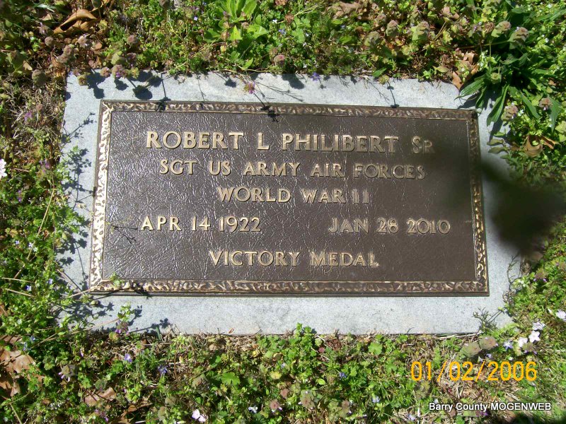 Inscription: "Husband of Willena, interred Maple Park Cemetery" - Research Note: Son of Charles Benjamin Austin Philibert and Elizabeth Applegate. - Dr. Robert L. Philibert, 87, Professor Emeritus, Missouri State University died Thursday, Jan. 28, 2010, at his home in Shell Knob. He was born on April 14, 1922, in Sawyer, KS. At the age of 16, he joined the Civil Conservation Corps (CCC), the Roosevelt-era work relief program. While stationed at CCC Camp 3753 in Shell Knob, Robert met his wife of 66 years, Willena. The couple was married on Dec. 6, 1942. He served with the 8th Army Air Corps at Kimbolton, U.K and was discharged at the end of the war in November, 1945. He graduated in 1952 with his Bachelors of Education in Biology. During the mid 1950s, he taught science classes at both Mt. Vernon and Monett high schools. In 1957, he was awarded a Defense for Education national fellowship, which allowed him to begin graduate studies at the University of Missouri, Columbia. In the fall of 1963, Robert joined the faculty of the Life Sciences Department at then Southwest Missouri State College teaching classes. He retired to Shell Knob in 1986 after 23 years of teaching. He was preceded in death by his wife Willena Rickman; parents Charles Benjamin Austin Philibert and Elizabeth Applegate; brother, Harold; sisters, Clara and Bethel; and one grandson. Survivors include: one sister, Maxine Haggerman, Shell Knob; one son, four grandchildren; daughter of Republic; daughter of Shell Knob; and four great-grandchildren. Funeral services were held today (Wednesday) at Fohn Funeral Home, in Shell Knob. Military honors and burial was at Painter Cemetery, Shell Knob following the services. - Military Stone - Inscription: "ROBERT L. PHILIBERT SP - SGT US ARMY AIR FORCES WORLD WAR II - VICTORY MEDAL" | Obit Donna Cooper Photos Jay Trace |