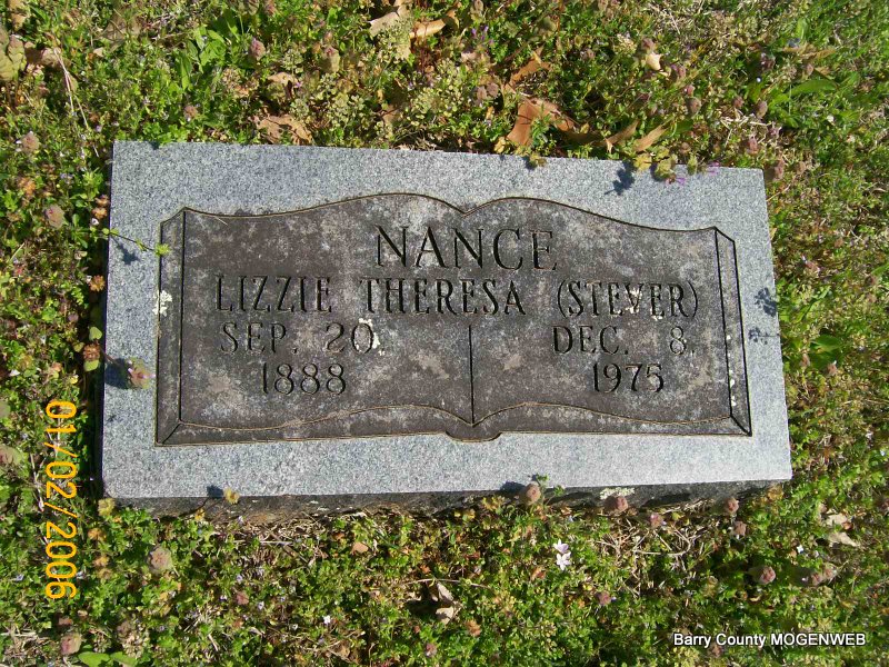| NANCE, Lizzie Theresa (STEVER) (JOHNSON) (WILLIS) | Sept. 20, 1888 | Dec. 8, 1975 Pottawatomie Co., OK |