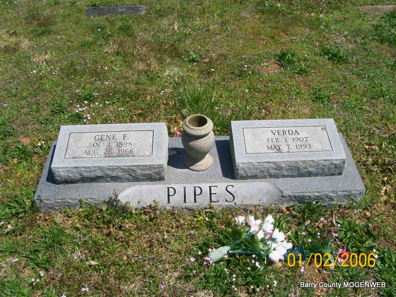 SSW: Verda - Research Note: Son of Obediah S. Pipes and Ida E. Metzger. He first married Lucy M. Courtney as given on their son's SS Claims Index. - Donna's Note: Culver Funeral Home listed Eugene F. Pipes as born in Clinton Co., MO, Jan. 4, 1898. (In 1900 Eugene Pipes was listed in the household of Loyd B. Leach and Ida Pipes with the birth date of Jan. 1898, in Atchison, Clinton Co., MO. Ida was age 25. Eugene was a nephew of Loyd B. Leach. Ida was Loyd's sister and a widow. She was born July of 1874 in MO.) On the Culver record, Verda Pipes was given as the wife of Eugene. The cause of Eugene's death was terminal pneumonia. He died in the V. A. Hospital, K. C., MO. He was a retired railroad foreman. His funeral was on August 28, 1966, 4:30 P. M. at Culver's Chapel in Cassville. Burial was in Painter Cemetery, near Shell Knob, MO, on August 28, 1966. Marriage of Eugene Pipes and Verda Lynch is recorded in Jackson Co., MO, with the date Sept. 10, 1943. He was 44 and Verda was age 36. - Military Stone - Inscription: "EUGENE F. PIPES - MISSOURI SGT CO G 140 INFANTRY - WORLD WAR I - PH" | Transcription Penny Cooper Bailey 1900 Census Marriage Record Culver Funeral Home, Vol. 12, Page 58, by Ted Roller Donna Cooper Death Certificate Census Phyllis Long Photos Jay Trace |