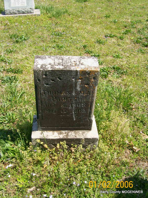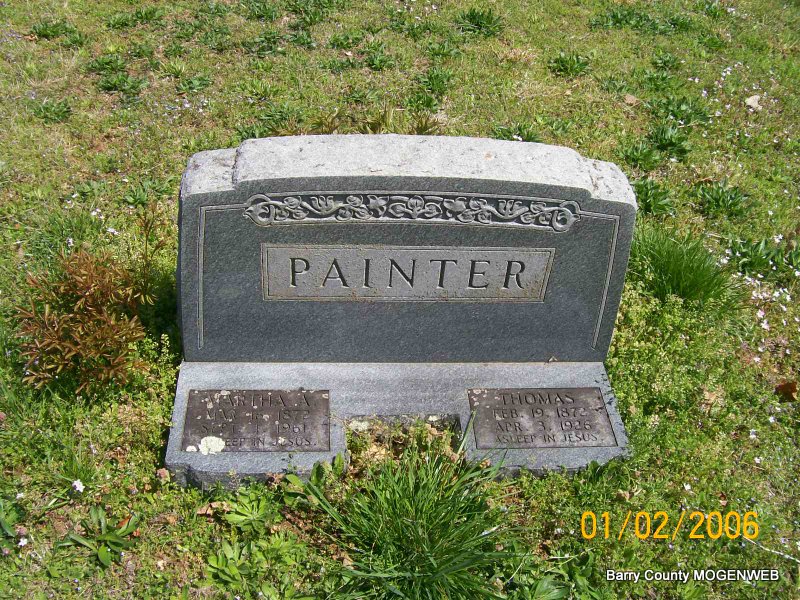 | PAINTER, Thomas | Feb. 19, 1872 | Apr. 3, 1926 | SSW: Martha A. - Research Note: Son of William Miles and Sara (Brock) Painter. Thomas Painter, age 19, married Martha Cooper, age 20, on Feb. 12, 1893 in Shell Knob, Barry Co., MO. William Painter, father of Thomas, gave consent. Note: William is buried in Center Cemetery Fidelity, Jasper Co., MO. | Transcription Penny Cooper Bailey MO Marriage Records Census Phyllis Long Photo Jay Trace Note Donna Cooper |