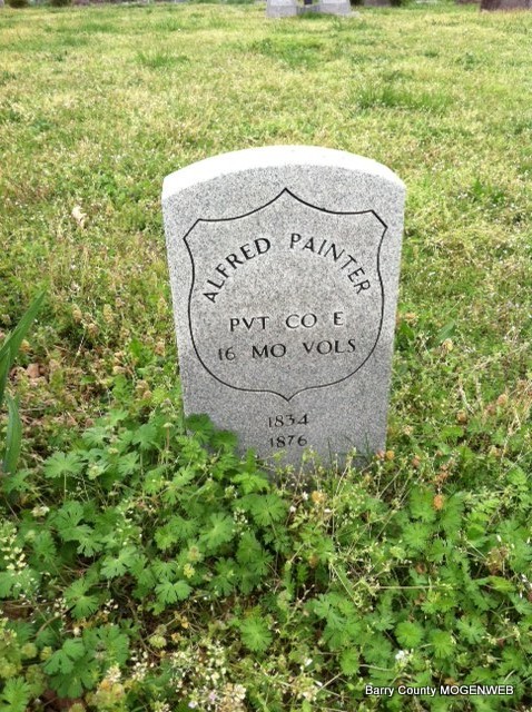 1876 | Inscription: "PVT CO E - 16 MO VOLS" - Research Note: Alfred was the son of Elisha and Mahala (Wilkinson) Painter. Researchers say his wife was Elizabeth Wilkerson. He was not counted on the 1880 census, but was listed in 1860 census in White River Twp., living next door to his parents, Elisha and Mahala. Listed - Alfred Painter, 26, Missouri, Male; Elizabeth Painter, 26, Missouri, Female; Wm. Painter, 5, Missouri, Male; Jacob Painter, 6 mos., Missouri, Male. - Goodspeed: In May, 1872, Alfred Painter was licensed to operate a ferry on the Springfield and Berryville Road. | Note US Census Donna Cooper Goodspeed's 1888 History Phyllis Long Photo Jay Trace |