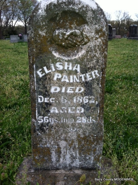 Dec. 8, 1862 | Inscription: "Age 56 ys., 1 mo. 28 ds." - Research Note: Son of Samuel and Elizabeth Painter. Husband of Elizabeth Wilkerson. - Donna's Note: His death date was transcribed as a birth date, so that was corrected and the inscription was added, which helped calculate his birth year correctly. Researchers have posted that Elisha was born Nov. 11, 1806 and that he married on Aug. 20, 1829 in Montgomery Co., IL, to Mahala Wilkinson who they say was born in 1811. They have that his parents were Samuel and Elizabeth 'Betsy' (Briance) Painter. Some of them claim that Mahala is buried Rocky Comfort Cemetery, and that she died Feb. 19, 1896. - In 1880 Mahala was living with her son William in White River Twp. of Barry Co., MO, and was age 68. - William Painter, 35; Sarah Painter, 29; Mary E. Painter, 11; Thomas Painter, 7; Nancy E Painter, 4; Fanna Painter 1; and Mahala Painter, 68. Mahala reported that she was born in TN, her father in NJ and her mother in KY. William reported that he was born in MO, that his father was born in NC, and his mother in TN. | Transcription Penny Cooper Bailey Note US Census Donna Cooper Photo Jay Trace |