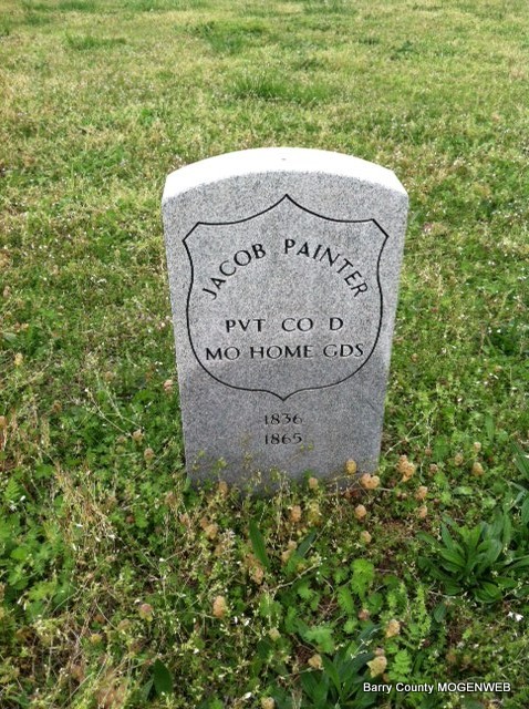 1865 | Inscription: "PVT CO D - MO HOME GDS" - Research Note: Jacob was listed in 1860 in White River Twp., in the home of his parents, Elisha and Mahala in household 30. - Elisha Painter, Farmer, 53, North Carolina, Male; Mahala Painter, 46, Tennessee, Female; Jacob Painter, 24, Missouri, Male; William Painter, 16, Missouri, Male; Lucinda Painter, 12, Missouri, Female; Marion Painter, 8, Missouri, Male. | Photo Jay Trace US Census Donna Cooper |