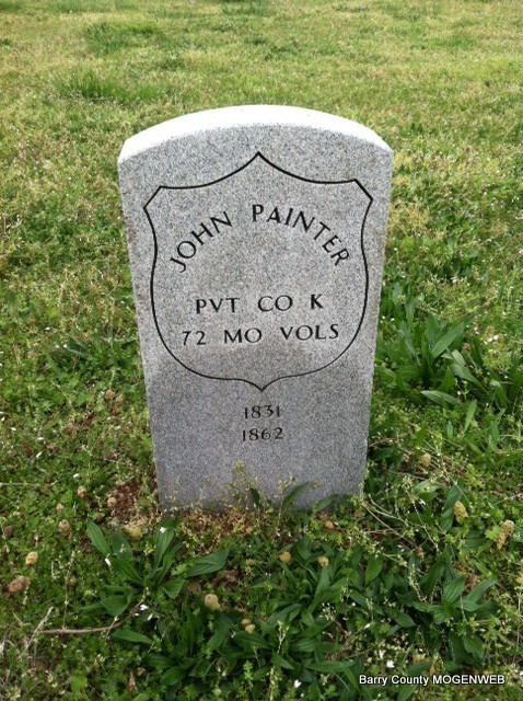 1862 | Inscription: "PVT CO K - 72 MO VOLS" - Research Note: Son of Elisha Painter and Mahala Wilkinson. John was listed in White River Twp., of Barry County in 1860 in household 79. - John Painter, Farmer, 28, Illinois, Male; Elizabeth Painter, 26, Tennessee, Female; William Painter, 5, Missouri, Male; Sarah M. Painter, 4, Missouri, Female; Martha Painter, 6 mos., Missouri, Female. | Photo Jay Trace US Census Donna Cooper |