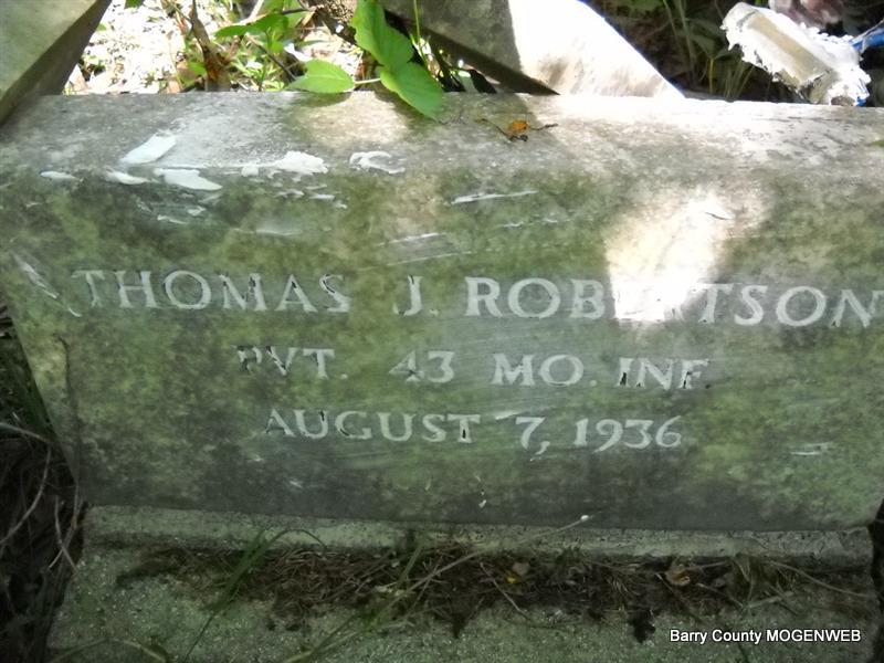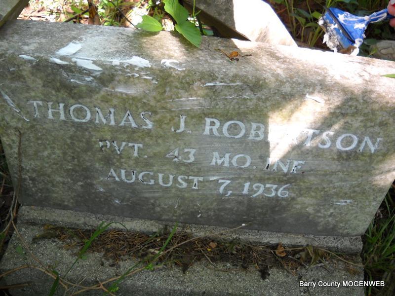 Inscription: "Pvt. 43 Missouri Inf." - Research Note: His wife was Elizabeth Robertson on the death certificate. Son of William Henry Robertson and Nancy P. Wilson, both born TN. James Robertson of Seligman, MO was the informant. His first wife was Mary Rebecca Burk. - Linda Skelton Corbin gives his birth date as Dec. 2, 1846 on his Civil War page, with parents born in KY. The military headstone was ordered on Dec. 30, 1937 by Floyd E. Fawver, Seligman, MO and shipped on Mar. 17, 1938 to James Robertson, Seligman, MO. - Pvt., Co. E, 43rd MO Inf. - According to stories told by Thomas Jefferson Robertson’s sister - Lucy Jane (Robertson) Oder, their mother (Nancy P. Wilson) died while the father (William Henry Robertson) and older brothers (including Thomas) were off fighting in the Civil War. She and her younger siblings buried their mother on the farm (at Golden). Lucy was age 13 and was in charge until her father came home from the war. Family tradition from several family members indicates that, "T.J. (Thomas Jefferson Robertson) was uneducated, but smart; he invented the quick setting monkey wrench and had it patented but let the patent run out and lost the royalties. He invented a street sweeper and never had it patented so the Elgin Company took over his idea and sold it. He was working on perpetual motion when he got sick and died." - Another Photo | Transcription Roger and Brandon Death Certificate Jay Trace Photos Donna Cooper Military Headstones Photo Phyllis Long |