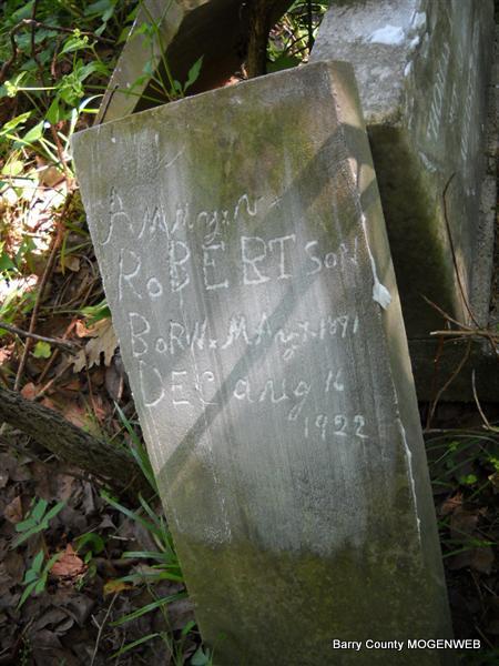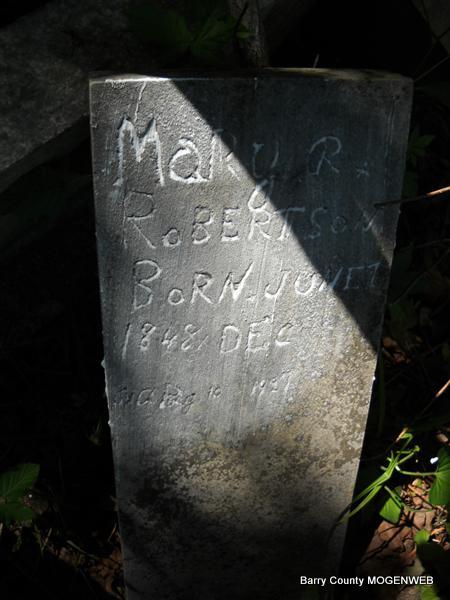 Research Note: Daughter of Thomas Jefferson Robertson and Mary Rebecca Burk, both born MO. Albert Robertson of Seligman, MO was the informant on the death certificate. Stone is off it base - homemade stone. | Transcription Brandon Photo Donna Cooper Death Certificate Jay Trace Photo Phyllis Long |