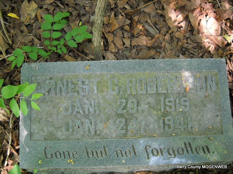 Inscription: "Gone but not Forgotten" - Research Note: Son of James Robertson born Golden, MO and Minnie Jones, born Washburn, MO. James Robertson of Seligman, MO was the informant on the death certificate. Flu was the cause of death. | Transcription Roger and Brandon Photo Donna Cooper Photo Death Certificate Phyllis Long |