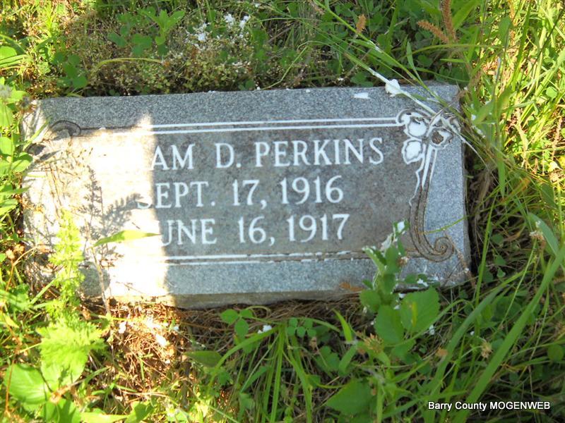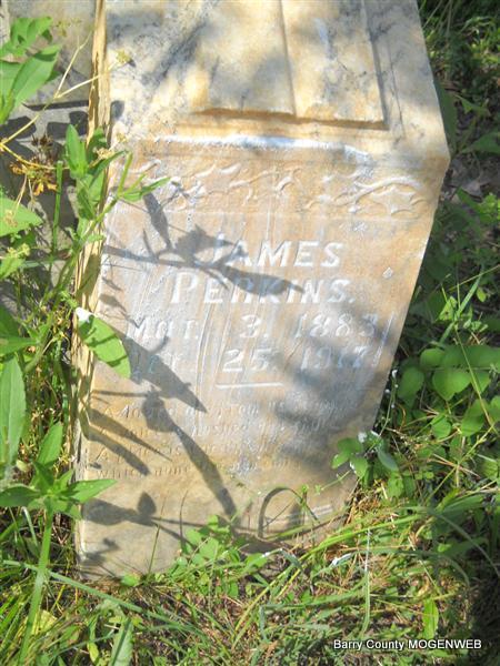 | PERKINS, James William | Mar. 3, 1883 | Oct. 25, 1917 | Research Note: Note: Son of Merit Perkins and Sarah Sons. James Perkins married Corda Wallace on Oct. 15, 1908 in Cassville, Barry Co., MO. Corda second married James W. Christian. | Transcription Roger and Brandon Photo Donna Cooper Census MO Marriage Records Photo Phyllis Long |