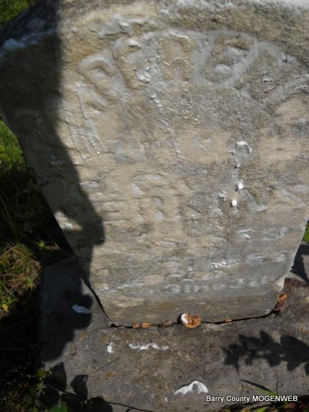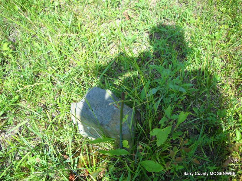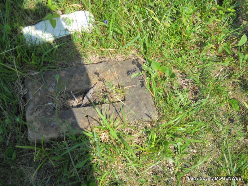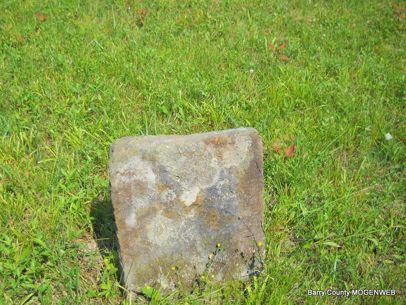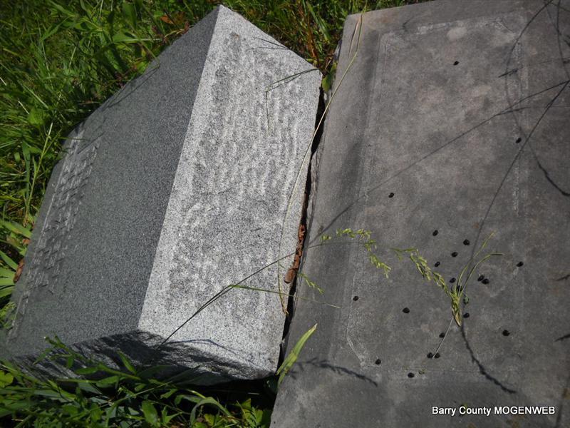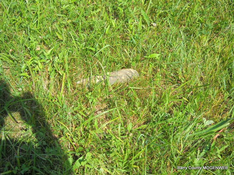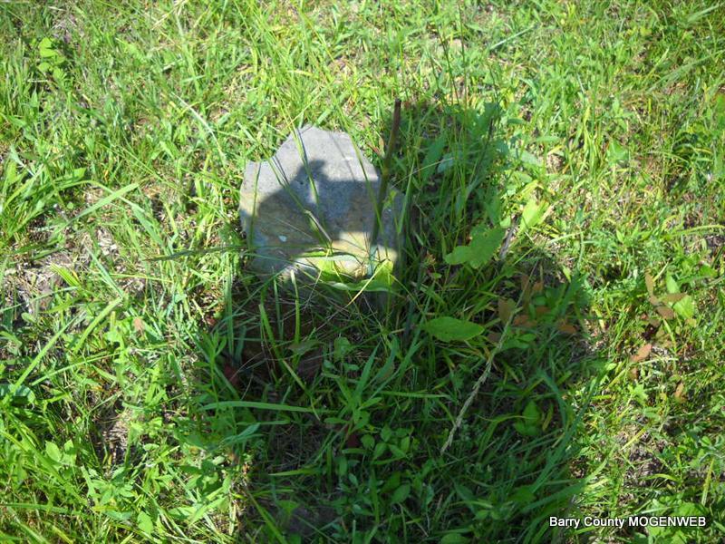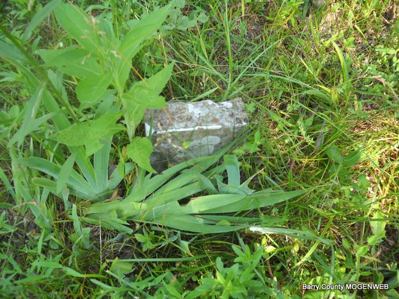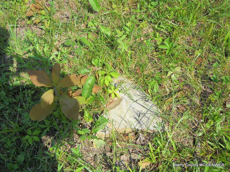 Inscription: "Daughter of W. M. and L. A." - Research Note: She was a daughter of William Newton, born KY, and mother's maiden name was Perkins (Larinda Perkins), born Barry Co., MO. Edward Newton of Seligman, MO was the informant. This stone is broken off the base and on the ground. - Another Photo | Transcription Roger and Brandon Death Certificate Photo Phyllis Long Photo Donna Cooper Photo Phyllis Long |