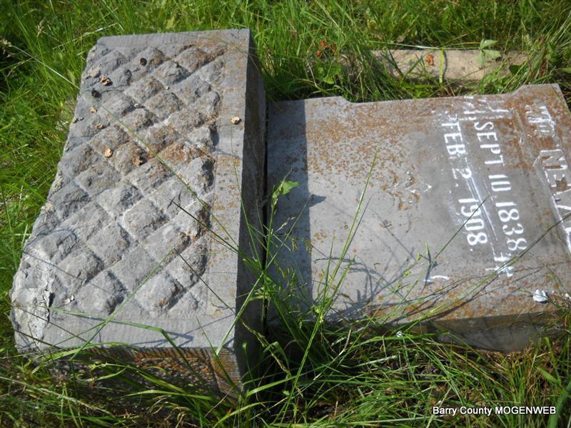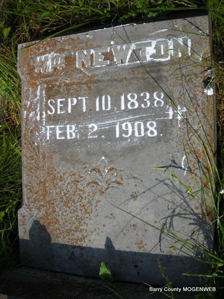 Feb. 2, 1908 | Inscription: "Father" - Research Note: Larinda Perkins married William Newton on Jan. 11, 1887 in Barry Co., MO. - Civil War Veteran: Private, Co. G, 1rst. Colo Cav. Served from Dec. 9, 1862 to Dec. 10, 1865. This stone is broken off from the base and is on the ground. - Another Photo | Transcription Roger and Brandon Photo Donna Cooper MO Marriage Records 1890 Vet. Census Photo Phyllis Long |