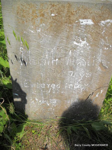 | MARTIN, M. W., Mrs. | Abt. 1827 | 1898 | Inscription: "Entered into rest 1898 - Age 71 yrs." - Research Note: This homemade marker is barely readable. | Transcription Brandon Photo Donna Cooper Photo Phyllis Long |