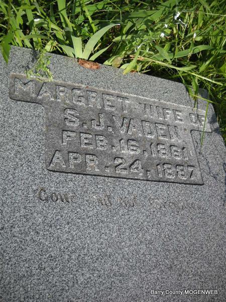 | VADEN, Margaret (PERKINS) | Feb. 16, 1861 | Apr. 24, 1887 | Inscription: "Margaret - Wife of S. J. - Gone but not Forgotten" - Research Note: Daughter of Dempsey William Perkins and Temperance Beaver. Her husband was Sydney J. Vaden. This stone is broken off from the base and on the ground. - Another Photo | Transcription Roger and Brandon Photo Donna Cooper Census Photo Phyllis Long |