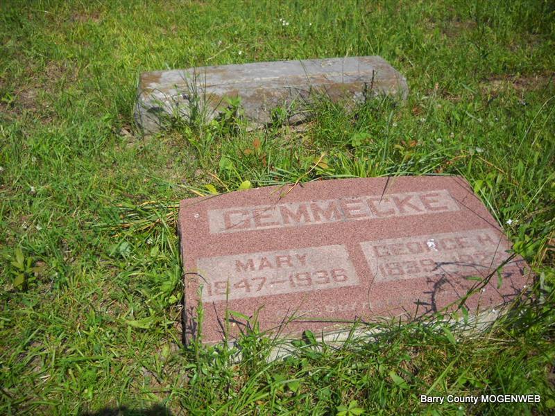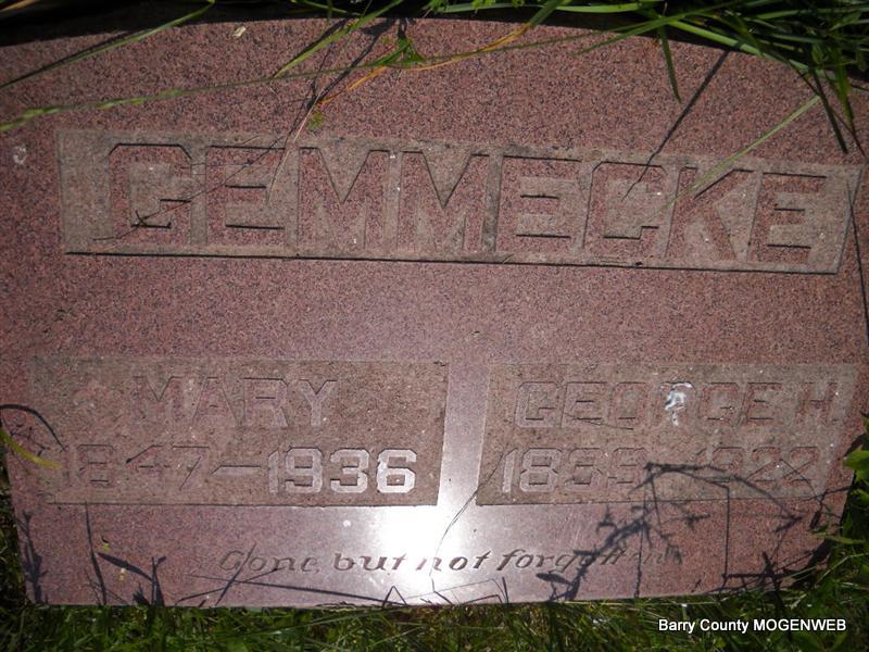 SSW: Mary - Inscription: "Gone but not Forgotten" - Research Note: The First Century of Seligman, MO - George Henry, son of George Henry Gemmecke and Mary Elizabeth Gussman, was born Jan. 1, 1839 in Hefgeismar, Germany. George met Mary Mae Martin of Pierce City, MO while he was working there on the railroad. They were married Feb. 10, 1872 in Sarcoxie, MO. George and Mary raised five children: Erva, May, Christopher Columbus, George Henry Jr. and Daniel Boone. - Death Certificate: He was 83 years, 4 months, and 5 days old. Son of John Gemmecke born Germany. Mother not listed on the death certificate. C. C. Gemmecke was the informant. This stone is broken off from the base and on the ground. It looks like cattle have run in this cemetery since so many of the large stones like this one have been knocked over. - Another Photo | Transcription Roger and Brandon Death Certificate Jay Trace Photo Donna Cooper The First Century of Seligman, MO Photo Phyllis Long |