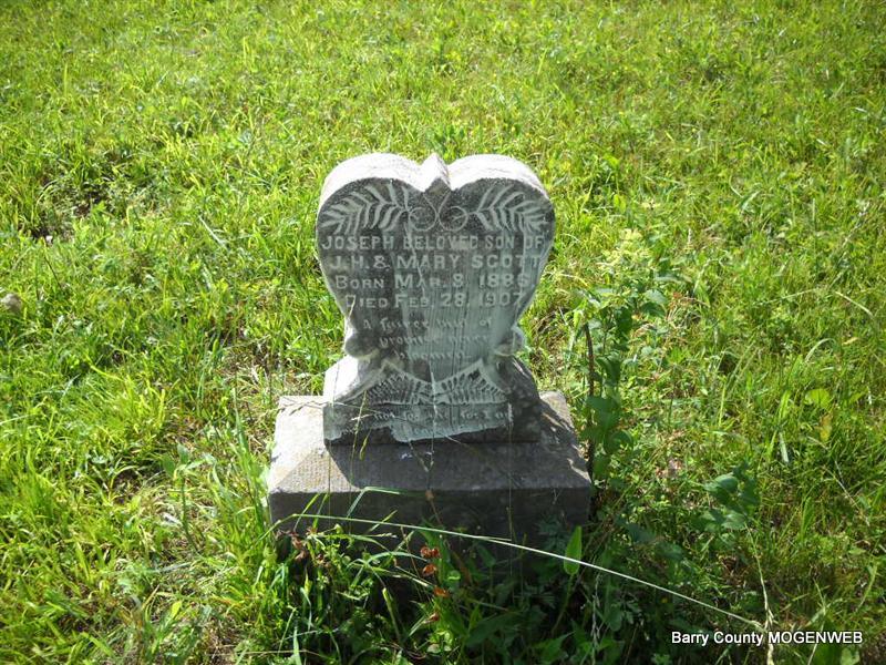 Feb. 28, 1907 | Inscription: "Beloved son of J. H. and Mary - A fairer bud of promise never bloomed. Weep not for me for I am waiting in heaven for thee" - Research Note: Son of John Henry Scott and Mary Susan Jones. | Transcription Roger and Brandon Photo Donna Cooper MO Birth Records Photo Phyllis Long |