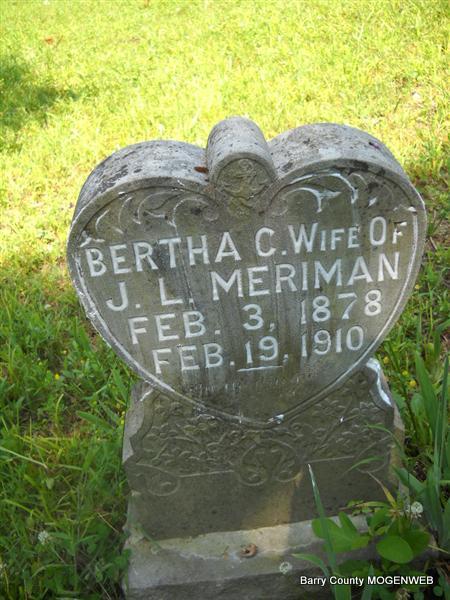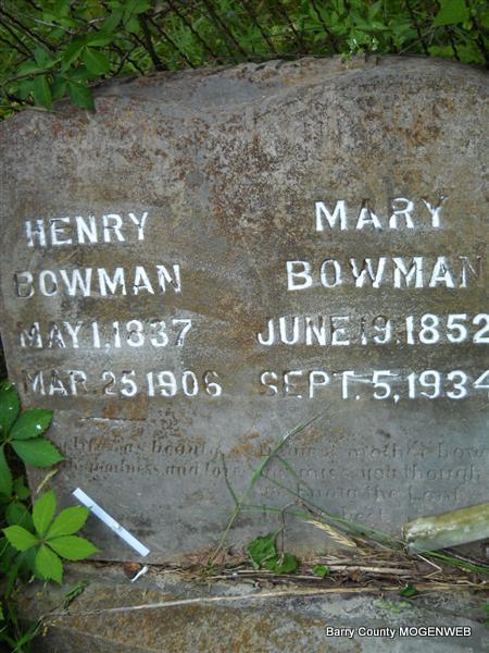 | BOWMAN, Mary (PERKINS) | June 19, 1852 | Sept. 5, 1934 | SSW: Henry - Inscription: "Dearest mother how we miss you though we know the Lord knew best." - Research Note: Daughter of Dempsey William Perkins and Temperance Beaver. Henry Bowman married Mary Perkins on Dec. 4, 1868 in Barry Co., MO. | Transcription Roger and Brandon Photo Donna Cooper MO Marriage Records Census Photo Phyllis Long |
