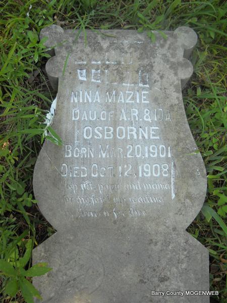 | OSBORNE, Nina Mazie | Mar. 20, 1901 | Oct. 12, 1908 | Inscription: "Daughter of A. R. and Ida - Weep not papa and mama for me for I am waiting in heaven for thee" - Research Note: Daughter of Ida Mae Forgey and Amos Robinette Osborne. Amos and Ida are buried at Roller Cemetery, Gateway, Benton Co., AR. Amos R. Osborne, age 32, married Ida Mae Forgey, age 23, on Jan. 14, 1900 in Barry Co., MO. Granddaughter of Mary Anne Robinette and Freeling D. Osborne. | Transcription Roger and Brandon Photo Donna Cooper Census MO Marriage Records Photo Phyllis Long |