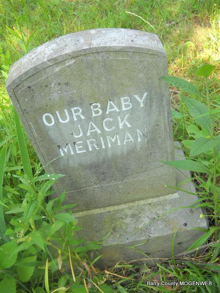 Inscription: "Our Baby" - Research Note: There are no dates on the stone. Last name spelled as "Merriman" on death certificate. Father was J. L. Merriman, born in Searcy Co., AR. Mother was Bertha Sherhy ?, born in MN. The cause of death listed as "Heart failure, injuries at birth. | Transcription Roger and Brandon Death Certificate Jay Trace Photo Donna Cooper Photo Phyllis Long |