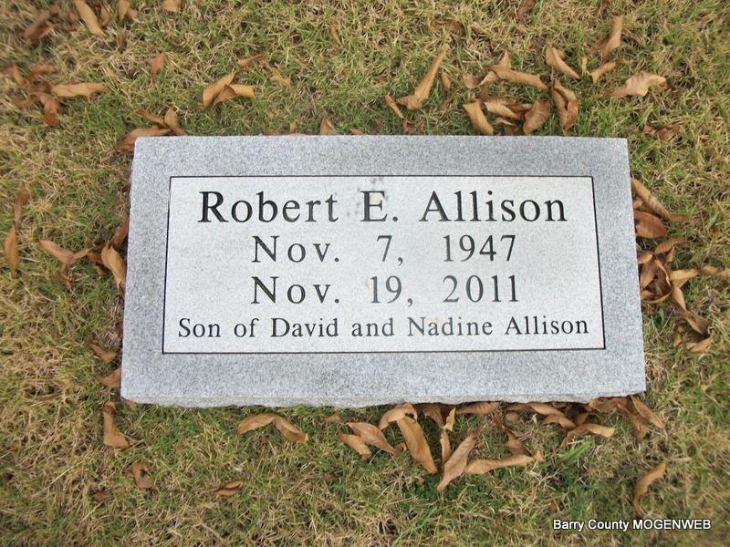 Inscription: "Son of David and Nadine Allison" - Research Note: Son of David Raymond and Nadine (Cooper) Allison. After Bob's service with the Air Force, he worked in the printing industry. Bob was preceded in death by a brother and his parents. He is survived by his two daughters from a prior marriage; his wife of 36 years; their children; three brothers; eight grandchildren; and one great-granddaughter. Bob was cremated and his ashes will be scattered by his family. A footstone has been placed in his honor at the base of his parents graves at the Pilant Cemetery in Cassville, Missouri. | Obit Phyllis Long Photo Diana Cope |
