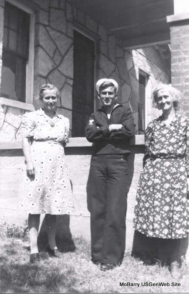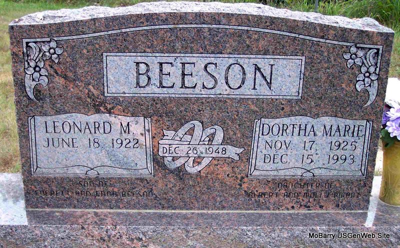SSW: Dortha Marie - Inscription: "Married Dec. 26, 1948 - Son of Everett and Edna Beeson" - Research Note: He was the son of Everett and Edna (Noble) Beeson. On December 26, 1948, in Exeter, Missouri, he was united in marriage to Dortha Pilant, who preceded him in death on December 15, 1993. Also preceding him in death were his parents; an infant sister, Betty Jewel; one brother, Laurance Beeson and two brothers-in-law, Ray Harris and Earl Lyall. Surviving are six children. Leonard received his education at Forest Grove Grade School and graduated from Cassville High School in 1941. After high school Leonard followed the wheat harvest in Kansas and Colorado, then went to Oregon to work in the logging industry. From November, 1942 through January, 1946, he served in the United States Navy as a signalman aboard the USS Custer, a troop transport in the Pacific Theater of WW II. He later spent forty-five years at Forest Products, Inc., in Cassville. - Photo of Leonard and Buddies, Leonard in the middle - Photo of Leonard, in the middle, and others - Photo of Leonard, his mother, and grandmother - Photo of Leonard and brother-in-law Ray Harris | Fohn Funeral Home Phyllis Long Photo Diana Cope |