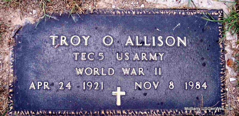 | ALLISON, Troy O. | Apr. 24, 1921 | Nov. 8, 1984 | SSW: Martha E. - Research Note: Son of Edward F. Allison and Mary Rosy Gautney. - Military Stone - Inscription: "TEC 5 US ARMY WORLD WAR II" | Census Phyllis Long Photo Diana Cope |