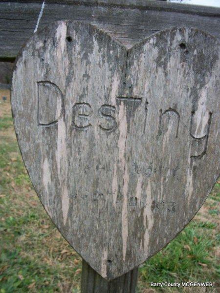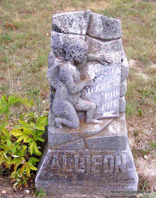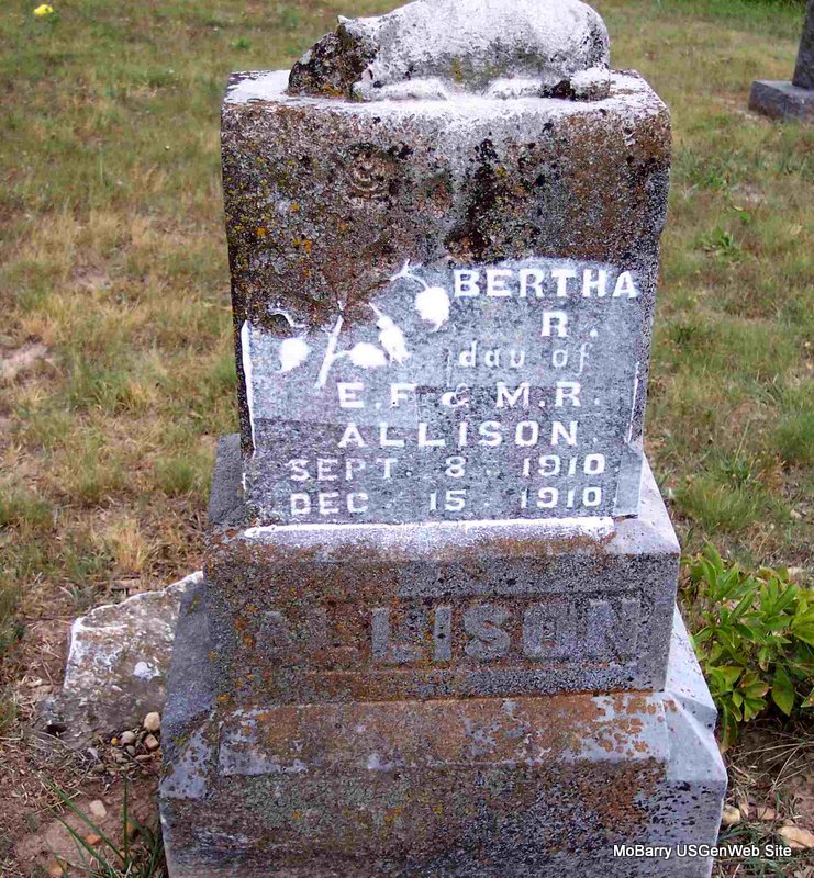 | ALLISON, Bertha Rogers | Sept. 8, 1910 | Dec. 15, 1910 | Inscriptions: "Dau. of E. F. and M. R." - Research Note: Her death certificate stated that she was born Oct. 8, 1910 not Sept. 8, 1910 as the stone reads and that she was 3 mos and 7 days old, which would probably make the Sept. date a correct one. It stated that she was a daughter of Ed Allison who was born in Cooper Co., MO and Rosa Gautney who was born in Barry Co., MO. | Death Certificate Donna Cooper Photo Diana Cope |