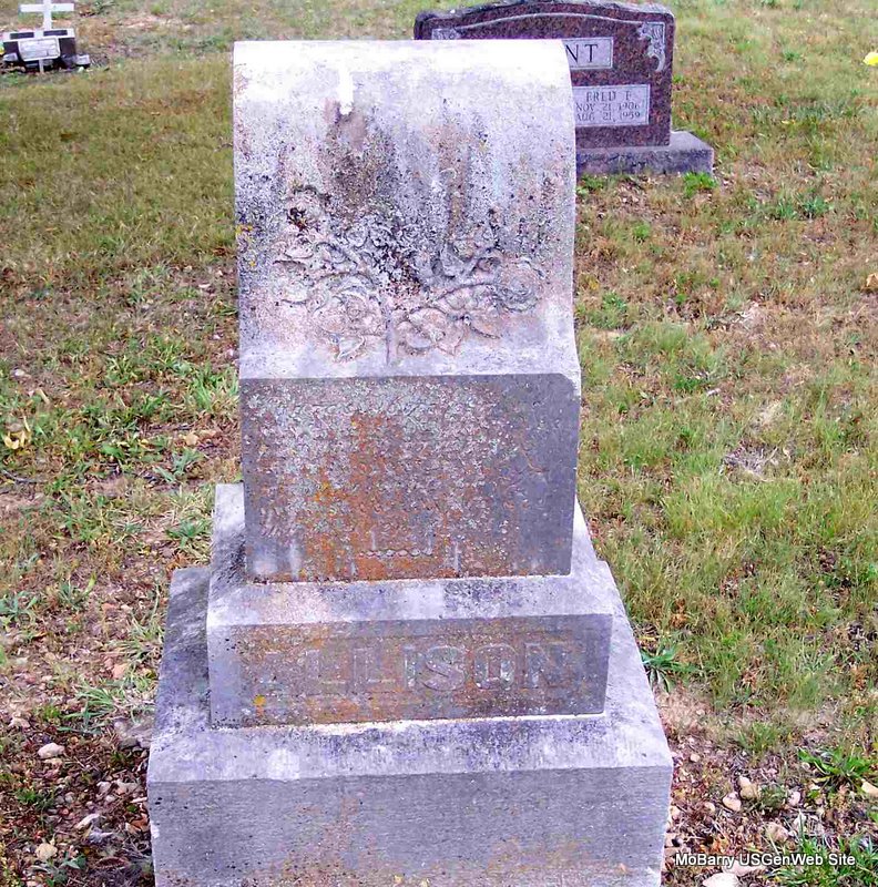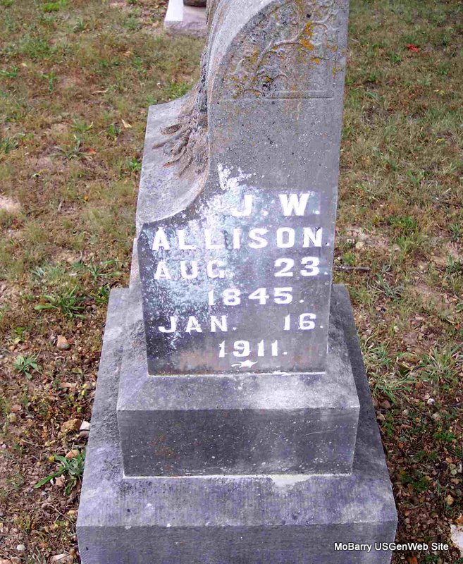 SSW: Mary Ann - Research Note: The death certificate gives no family record. He was a farmer and E. F. Allison of Cassville, MO was the informant. Son of Joseph Allison and Amanda Pierce. - Cassville Republican, Thursday, Jan 26, 1911- Oak Ridge News: Following a long illness, J. W. Allison died at the home of his son, Ed Allison, on the J. E. Pilant farm, north of town, 11 miles, Jan. 16, 1911. For months Mr. Allison had been in ill health and gradually gave way to his complication of troubles. He was taken to the home of his son, Ed, that he might be well cared for. J. W. Allison was about 67 years of age and had lived about Cassville for many years where he was held in highest respect, being a quiet, upright industrious citizen and Christian gentleman. Funeral services were conducted by Rev. J. W. Ennes and interment made in the Pilant Cemetery. The bereaved family consists of a wife, two sons, Edward, and Price, and two daughters, Mrs. Marion Hesse, east of town, and Mrs. Wm. Dodge of Monett. - Daughter Marion's obit - Back of Stone | Photo Diana Cope Death Certificate Online Newspapers Census Phyllis Long |