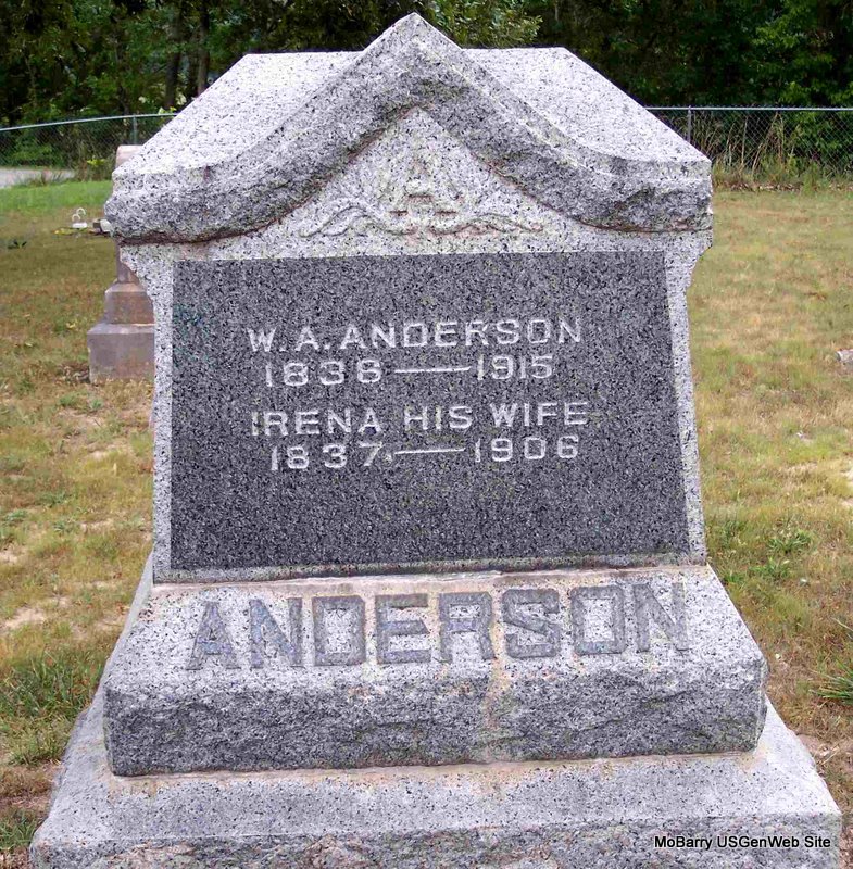 SSW: Nancy Irena - Research Note: Civil War Veteran: Co. A - 15th Northwest Arkansas Infantry - Son of James Robert Anderson. Walter first married Nancy Irena "Rena" Evans. Walter A. Anderson, age 69, married Louisa J. (Stewart) Martin, age 63, on Aug. 12, 1906 in Cassville, Barry Co., MO. Walter A. Anderson, age 78, married Mrs. Mary Allison, age 61, on Dec. 10, 1914 in Barry Co., MO. Parents not listed on the death certificate. - December 17, 1914, Thursday, Cassville Republican - East Point News: Walter Anderson and Mrs. Mary Allison were married at the residence of Rev. J. W. Ennis Thursday, Dec 10. Rev. Ennis officiating. - Same paper: Licenses to Wed: Walter A. Anderson, 78, Cassville and Mrs. Mary Allison, 61, Cassville. - November 4, 1915, Thursday, Cassville Republican - Oak Ridge News: W. A. Anderson died very suddenly Friday morning and was buried at Pilant Cemetery Saturday afternoon. - Nov. 4, 1915, Cassville Republican - Pioneer Citizen Crosses Over: Walter Anderson, one of the oldest citizens of this county , died at his home NE of Cassville, Friday morning, Oct. 29, at the age of 79 years and 7 days of heart failure. Mr. Anderson had been in good health until Sunday when he was taken sick but head not been bad and his condition did not appear serious. Friday morning he got up and had breakfast and said he was feeling well. His half brother, Jack Anderson, who had been helping wait on him since he had been sick states that he told him Friday morning to go to town for some more medicine but to tell his physician that he had no pain and was feeling better than for some time. His brother started to town and before reaching here was called by phone and informed that Mr. Anderson had passed away suddenly after he left. Walter Anderson was born west of Washburn, then Keetsville, in Barry County, Oct. 22, 1836. When only a small child his parents moved to Benton County, AR. They lived in Benton and Washington counties until after the Civil War. Mr. Anderson served in the Confederate army during the war and soon after peace was made, possibly sometime in the seventies, he moved to this county and located near Cassville and continued to live here until his death. He had been married three times, his last wife, Mrs. Mary Allison, survives him. He had no children. He leaves four half brothers, Jack, Vanus, Robert and William Anderson, all of Cassville. Mr. Anderson was one of the county's most substantial citizens. He had been a successful farmer. Was a man of unquestioned integrity and always stood firmly for what he believed to be right. Funeral services were held Saturday afternoon, conducted by Rev. J. W. Ennes and interment made at the Pilant cemetery north of Cassville. - Cassville Republican, Nov. 4, 1915, Thursday - Anderson's Will Probated: The will of Walter Anderson has been filed for probate in the office of Probate Judge Landis. The will bears the date of July 4, 1914. It gives all of his property, both real and personal to I. N. Wirts, whom Mr. Anderson reared, and of whom he thought of as a son. W. H. Martin, cashier of the First National Bank of Cassville, was named in the will as executor. It is thought that the property left will inventory about $4,000 to $5,000. A later will had been drawn a short time before Mr. Anderson's death by his attorney, J. S. Davis, in accordance with Mr. Anderson's request but he had never executed it. | Photo Diana Cope Death Certificate Donna Cooper Online Newspapers MO Marriage Records Phyllis Long |