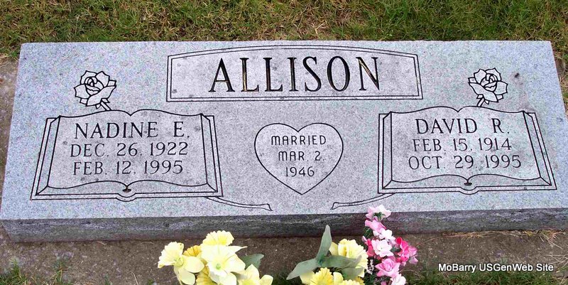 | ALLISON, David Raymond | Feb. 15, 1914 | Oct. 29, 1995 | SSW: Nadine E. - Inscription: "Married Mar. 2, 1946" - Research Note: Son of Edward F. Allison and Mary Ann Wright. | Census Phyllis Long Photo Diana Cope |